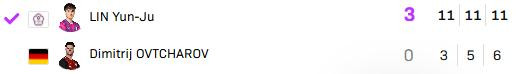 比赛第一局的走势特别极端,奥恰洛夫3-2领先直接迷失自我,连输九分溃败落下风,此后也没有反弹迹象。林昀儒牢牢掌控节奏,高质量拧拉是得心应手,几乎没有太多主动失误,3比0速胜,三局总共丢14分,如此容易着实略感意外。