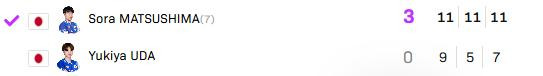 一场日本男队的内战,彼此之间无疑是格外熟悉,比赛过程也不出意料,双方节奏很快,几乎全是前三板的比拼,只要有机会就发动强势的进攻,相持回合寥寥无几。宇田幸矢没有很好的应对办法,偶尔形成缠斗,但后继乏力,反观松岛辉空则尽显优势,一直处于自己较为舒适的环境,3比0轻松告捷。