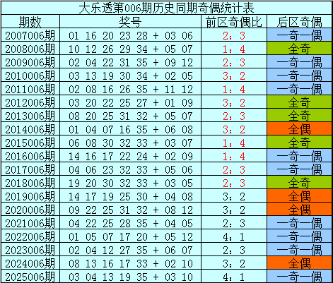 前区第二位:在历史第006期同期开奖中分布范围在04-22区段,平均值为12.3,奇偶比为4:15,目前奇数号码遗漏了1年,今年第006期注意奇数号码回补,关注号码03。